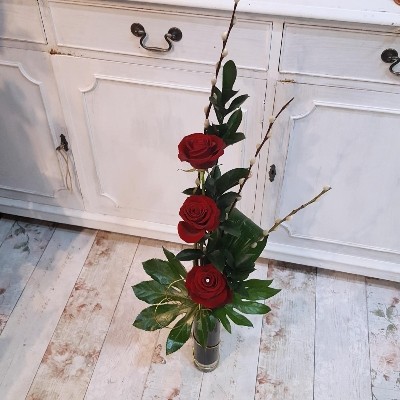 This timeless love vase includes three red roses and was designed in house by one of our Award Winning Team.