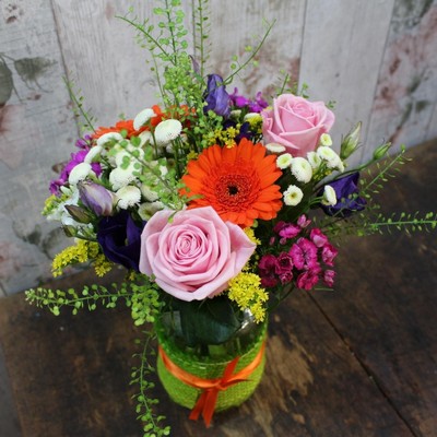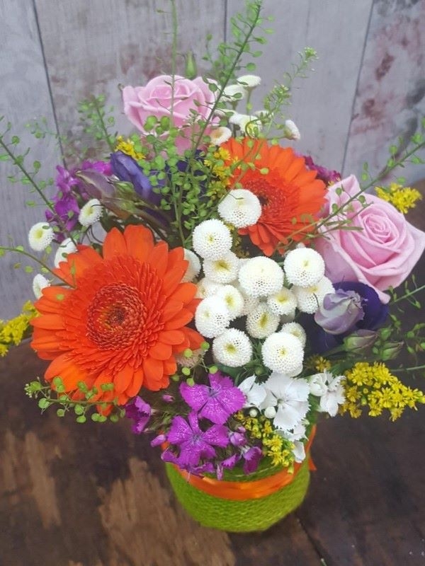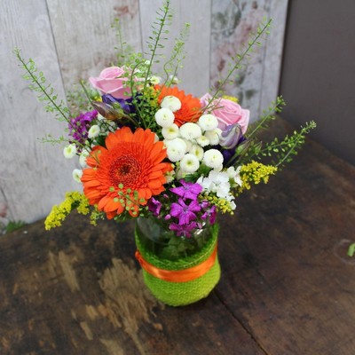 A tasteful selection of flowers, arranged in an informal but fun Jam Jar, sure to brighten anyone's day.