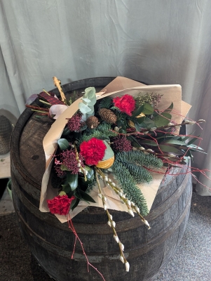 This beautiful Christmas hand tied bouquet is designed in our main street studio in Blairgowrie, by our Award Winning Team of skilled florists. This design is available for delivery throughout out our local area, with personal deliveries in Blairgowrie, Rattray, Alyth, Meigle, Newtyle, Ardler, Coupar Angus, Collace, Campmuir, Balbeggie, Burrelton, Guildtown, Dunkeld, Butterstone, Stanley, Luncarty and all areas in between.