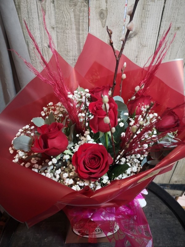6 large headed red roses and foliage, designed in a reservoir of water and ready to hand to your Valentine.